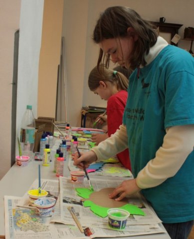 Zum Beginn des Donnerstags hat eine Besprechung stattgefunden, in der gesagt wurde, welche Materialien noch benötigt werden und was für den Tag ansteht. Anschließend machten sich die Teilnehmer an die Arbeit, wobei einige Schüler ein Gestell für das Schloss konstruierten, der Rest arbeitete an dem Baum. Die Schüler, welche an dem Gestell arbeiten sollten, überbrückten die Zeit, in der Frau Uibrig weitere Materialien kaufte, indem sie an kleinen Fantasietieren aus Pappe bastelten. Kurz nach 11.00 Uhr begannen die Schüler mit dem Bemalen des Baumes, wobei sie rote und grüne Leuchtfarbe mischten und hofften, dass diese Mischung ebenfalls leuchtet.