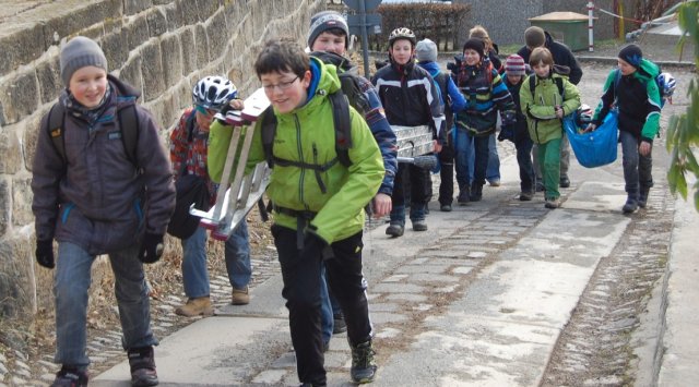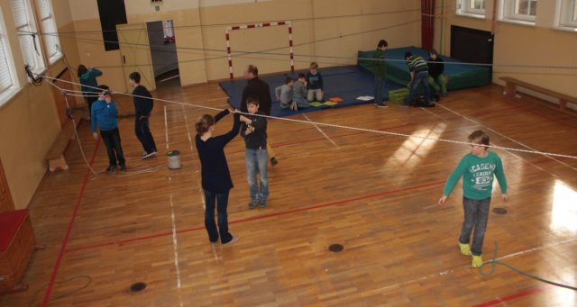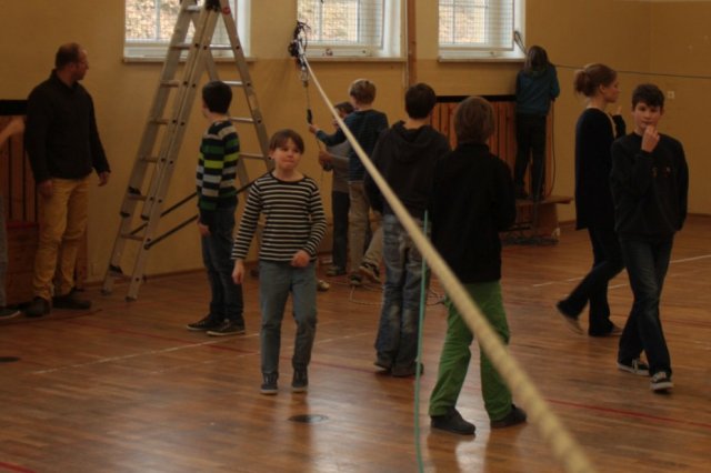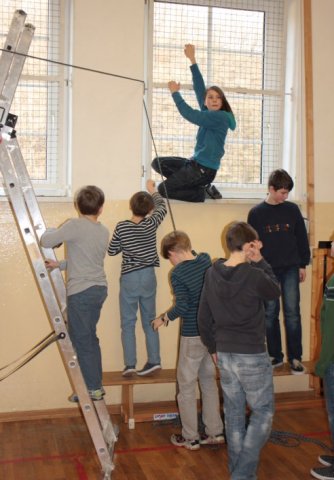 Heute wurden die ersten Vorbereitungen für das Projekt „Seilbahn“ getroffen, den Schülern zeigte man, wie sie sich mit Hilfe von Knoten u.a. sichern können. Es gab verschiedene Gruppen mit speziellen Aufgaben, zum Beispiel musste sich eine Gruppe um das Abbremsen ihrer Mitschüler kümmern. Jede Gruppe war auch zum Teil für die Sicherheit aller zuständig. Heute wurde das Modell der Seilbahn fertiggestellt.