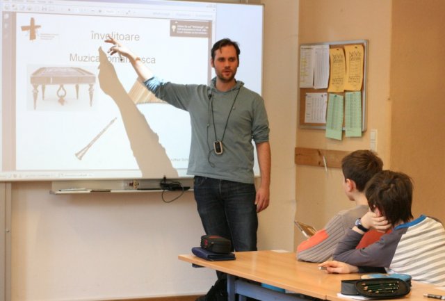 Am ersten Tag des Projekts wurden erste Eindrücke und Einfälle zum Thema gesammelt und Fragen zu den Themen Kultur, Sprache und Einwohner geklärt. Danach wurden viele verschiedene rumänische Süßigkeiten und Spezialitäten verkostet. Frau Erli und Herr Schumann erklärten mit Hilfe von Power-Point-Präsentationen und anhand von Musikbeispielen berühmte rumänische Persönlichkeiten, typische Musikinstrumente oder verschiedene Musikrichtungen. Darauf folgte ein leichter rumänischer Volkstanz, der von den Schülern, unter der Leitung von Frau Erli, mit viel Spaß getanzt wurde.