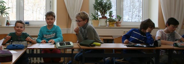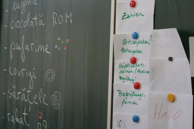 Anschließend legten sich die Schüler einen kleinen rumänischen Wortschatz in einem selbstgebastelten Wörterbuch an. Gelernt und aufgeschrieben wurden Wörter und Phrasen zur Begrüßung, die Zahlen bis 10 oder auch Wegbeschreibungen. Nebenbei erklärte Frau Erli noch einige Redewendungen und die Aussprache von einigen Buchstaben des rumänischen Alphabets.