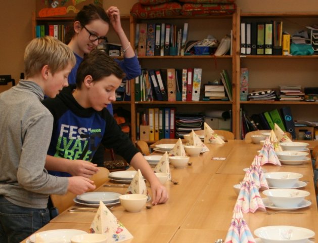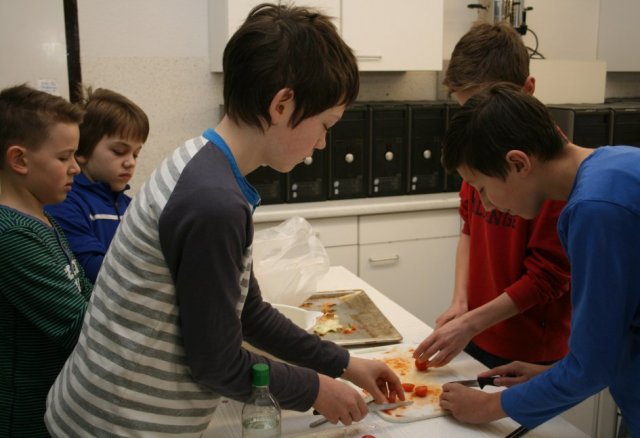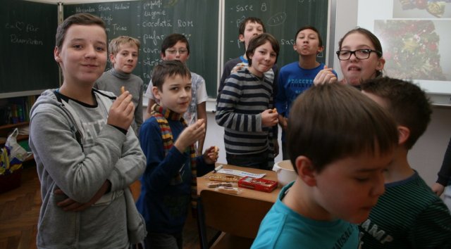Zuerst stellte Frau Erli die verschiedenen vier Gänge auf Rumänisch mit den dazugehörigen Rezepten vor. Dann ging es auch schon los. 13 Schüler fanden sich in der Küche zusammen und die Aufgaben für die Zubereitung wurden verteilt.