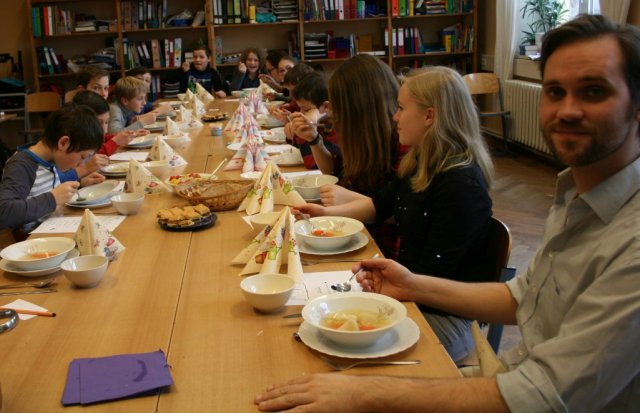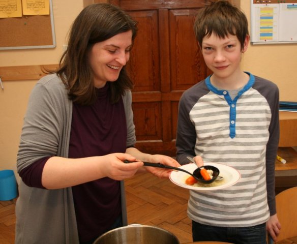 Die Köche kochten mit sehr viel Spaß die Gerichte, während rumänische Musik lief. In der ganzen Schule roch es sofort lecker nach rumänischem Essen: Es gab Auberginenmus mit Tomaten und dazu kleine Fleischbällchen (chiftele) als Vorspeise. Danach wurde den Schülern eine leckere Nudelsuppe als erster Gang serviert, die Frau Erlis Mutter einen Tag zuvor zubereitet hatte. Als zweiten Gang gab es hervorragende Schnitzel mit Kartoffelpüree und Salat. Darauf wurde ein leckeres cremiges Dessert als Nachspeise serviert.