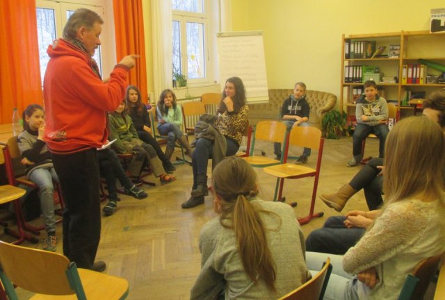 Heute erklärte Herr Ley den Projektteilnehmern, wie man auch ohne Sprache kommunizieren kann. Das veranschaulichte er ihnen mit einem kleinem Sketch. In diesem las eine Frau eine Zeitung und ein Mann versuchte sie anzusprechen. Provokant klappte sie die Zeitung hoch und gab ihm auch ohne Worte zu verstehen, dass sie nicht mit ihm reden möchte.