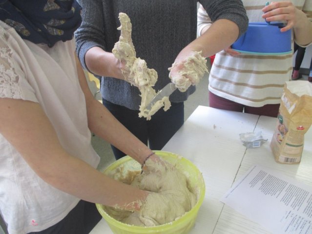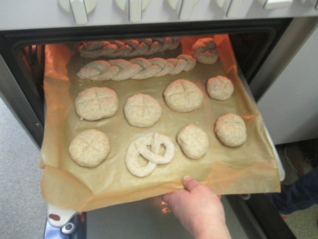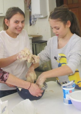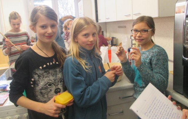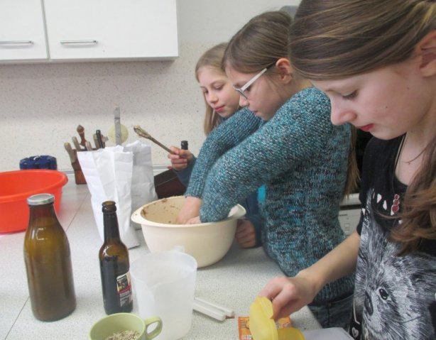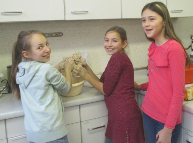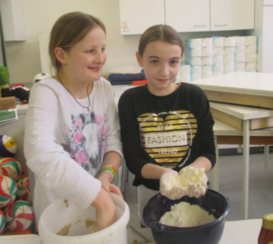 Die Schüler haben einen kurzen Film gesehen und danach eine Ernährungspyramide erstellt. Dadurch stellten sie fest, dass man am Tag sehr viel Wasser trinken sollte. Danach waren die Yoga-Kids unten in der Küche. Dort backten sie verschiedenste Brote und Brötchen. Wir durften viele Fotos schießen. Es sind viele verrückte, aber auch ordentliche Fotos herausgekommen. Wir haben ein Interview mit einem Mädchen aus der 5B gemacht. Sie war in der Gruppe von dem Joghurt-Brot. Wir fragten sie, ob sie dieses außergewöhnliche Brot schon einmal gegessen hätte. Sie antwortete mit: „Nein, nicht dass ich wüsste.“ Ob sie denkt, dass daraus ein leckeres Brot wird? „Ja, natürlich wird es ein leckereres Brot werden.“ Wir flinken Reporter wollten noch eine Stufe höher und fragten sie, ob sie irgendwas mit Ernährung von Beruf her werden möchte. Sie antwortete: „Mir würde es gefallen, aber eigentlich ist es nicht so mein Ding.“ So bedankten wir uns für das kleine Interview und machten uns auf den Weg zu unserer Redaktion. Wir sind nochmal zu unseren Yoga-Kids gegangen und haben miterlebt, wie sie Butter hergestellt haben. Selbstverständlich wollten wir sie nicht enttäuschen, und schnappten uns etwas Kleines von ihren Köstlichkeiten. Es war sehr lecker!