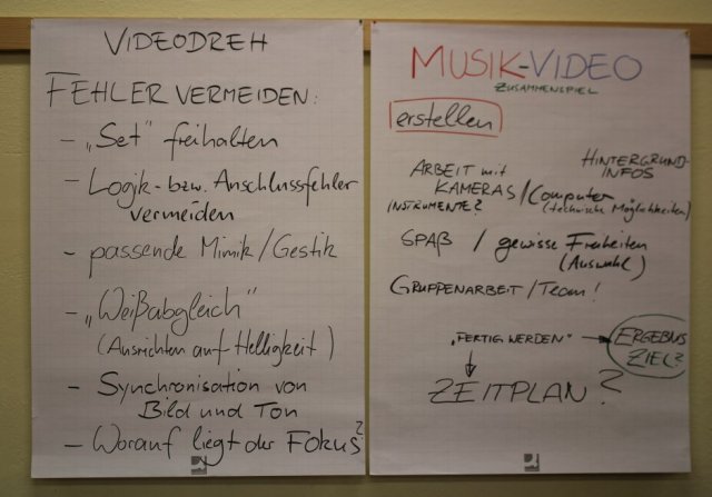 Die Projektteilnehmer bekamen als erstes einen Musikclip gezeigt, welchen sie anschließend analysiert haben. Es wurden Punkte wie z.B. Aufbau, Takt und verschiedene Wechsel in der Melodie besprochen. Die Analysen haben in Vierergruppen stattgefunden. Damit Fehler möglichst von vornherein vermieden werden können, wurde besprochen, worauf die Schüler achten müssen. Als wichtige Punkte wurden z.B. die Kameraführung, Licht, Ton oder Anschlussfehler genannt.