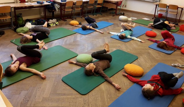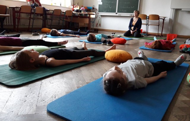 Am Dienstag starteten die Schülerinnen mit einer Meditation und danach hielten sie den Sonnengruß ab. Nach ein paar weiteren Yogaübungen teilte die Projektleiterin Frau Hausold ein paar Mandalas zum Selbstgestalten aus, diese trugen zur Entspannung bei. Die Schülerinnen fingen an diese zu gestalten und nach einer halben Stunde konnte man schon die halb fertigen Ergebnisse betrachten. Danach durften sich die Schülerinnen wieder gegenseitig massieren und entspannen. Als Abschluss las die Projektleiterin noch eine Yoga-Geschichte vor, in der Übungen vorkamen, die die Schülerinnen machen konnten.