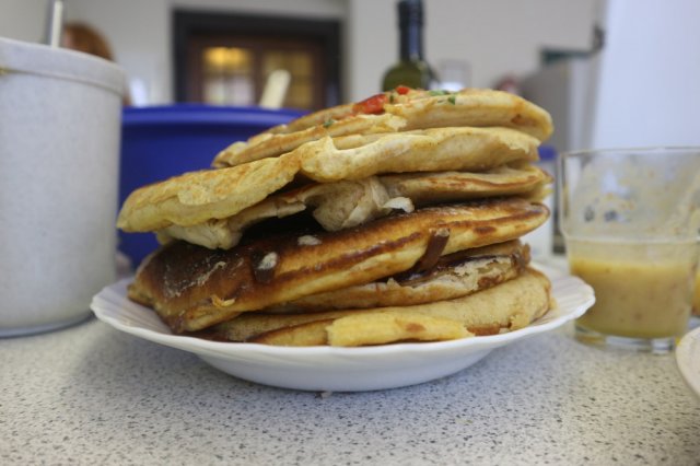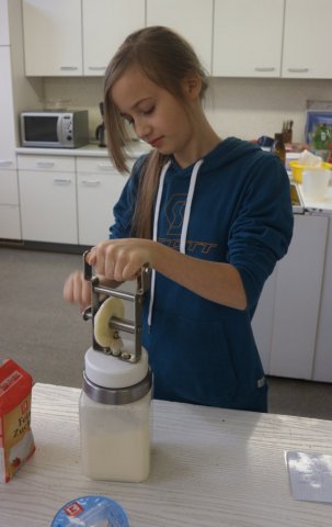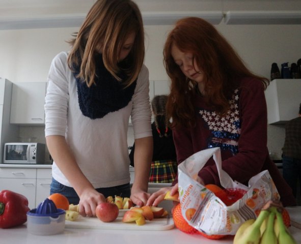 Am Donnerstag trafen sich die Projektteilnehmerinnen wieder in der Küche, da heute Eierkuchen mit Äpfeln, Müsliriegel und Smoothies gemacht wurden. Jeder bekam eine Aufgabe und so machte eine Gruppe die Eierkuchen und die anderen beiden zwei verschiedene Müsliriegel-Sorten. Jeder ging seinen Aufgaben nach und so waren die Schülerinnen pünktlich zum Mittagessen fertig. Alle deckten den Tisch und stellten noch den restlichen Dip und das Brot vom Mittwoch hin. Dazu wurden auch noch Karotten auf den Tisch gestellt und mit dem Dip zusammen gegessen. Nach dem Essen wurde die Küche wieder sauber gemacht und aufgeräumt. Damit endete die Projektwoche.