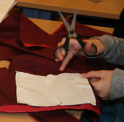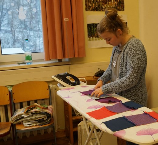 Am ersten Tag im Zimmer 103 wurde unter der Aufsicht von Frau Klingauf und Frau Münnich fleißig damit angefangen, Patchworkbezüge für Kissen zu nähen. Dafür mussten aus beliebigen Stoffen quadratische Teile ausgeschnitten werden. Überall im Raum lagen bunte Stoffe und es gab insgesamt 1 Bügeleisen und 5 Nähmaschinen, es sah aus wie in einer Nähwerkstatt. Beim Auswählen der Stoffe (also der Farben und Muster) konnten die 12 anwesenden Schülerinnen ihrer Kreativität freien Lauf lassen.