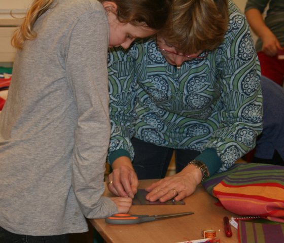 Donnerstag ging es für die zweite Gruppe an die Rückseite des Bezuges. Konzentriert wurde gearbeitet, damit man am Ende des Tages auch fertig sein würde. Es wurde gebügelt, genäht, geschnitten und auch die Nähmaschinen kamen wieder zum Einsatz. Die Teilnehmer waren unterschiedlich weit, weswegen auch schon nach kurzer Zeit Ergebnisse gezeigt wurden konnten. Schöne fertige Kissen konnten nun vorgezeigt werden.
