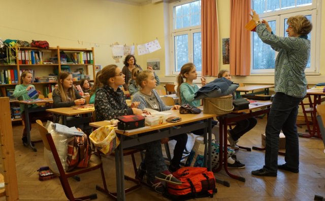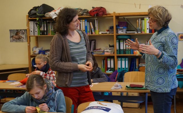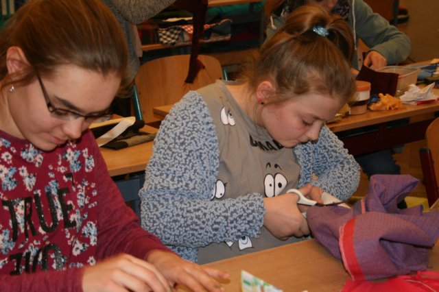 Am Anfang hat Frau Klingauf das weitere Vorgehen erklärt und dann ging es auch schon los. Die Schülerinnen (heute nur noch 11 Mädchen) sind unterschiedlich weit, aber die Nähmaschinen kamen gleich zum Einsatz. Einige Mütter waren auch da, um die beiden Lehrerinnen zu unterstützen, sie haben den jungen Näherinnen bei dem komplizierten Vorgehen geholfen. Danke dafür! Im Klassenzimmer der 5B (103) sollten an diesem Tag die Bezüge fertig genäht werden. Es sind sehr schöne Patchwork-Kissenbezüge entstanden und auch die Mädels sind zufrieden mit ihrer Arbeit.