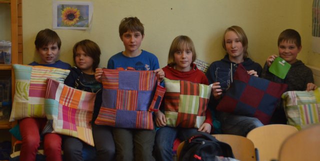 Am Ende konnten wir noch ein tolles Foto von den Nähern mit ihren Werken machen. Auch Jungen sind geeignet für Handarbeit, wie wir finden. Bunte, selbstgenähte Kissen werden jetzt die Zimmer der Teilnehmer schmücken oder sie werden verschenkt, wie wir erfahren haben.