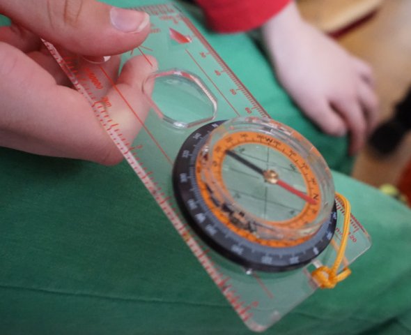 Nach dieser erholsamen Pause ging das Projekt weiter; jetzt sollten die Schüler auf ein Blatt schreiben, welche Zeichen und Formen sie auf der Karte sehen und was diese vermutlich für Bedeutungen hatten. Auch das wurde im Anschluss mit Herrn Kahl und Frau Geißler ausgewertet. Anhand dieser Ergebnisse konnte dann eine Legende erstellt werden, welche Herr Kahl an die Tafel schrieb. Als auch das erfolgreich abgeschlossen war, wurde der Kompass eingeführt, besprochen und ein paar kleinere Übungen durchgeführt. Um einen schönen Abschluss für den Tag zu haben, ging die Gruppe raus und übte anhand einiger Spiele, was sie zuvor gelernt hatte.
