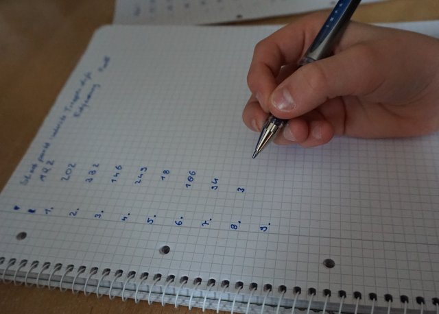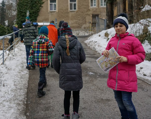 Als wir kamen, hatten die Schüler des Projekts schon eine Karte von Tharandt vor sich liegen und hörten Herrn Kahl und Frau Geißler gespannt zu. Um das Umgehen mit Koordinaten zu üben, bestimmten die Schüler erst die Koordinaten der Schule und im Anschluss die Koordinaten der Tharandter Bergkirche. Am Ende der Übung wurde beides verglichen. Nachdem die Gruppe sich mit diesen Aufgaben gut auf ihre Bewegung im Gelände vorbereitet hatte, hatten sie Mittagspause.