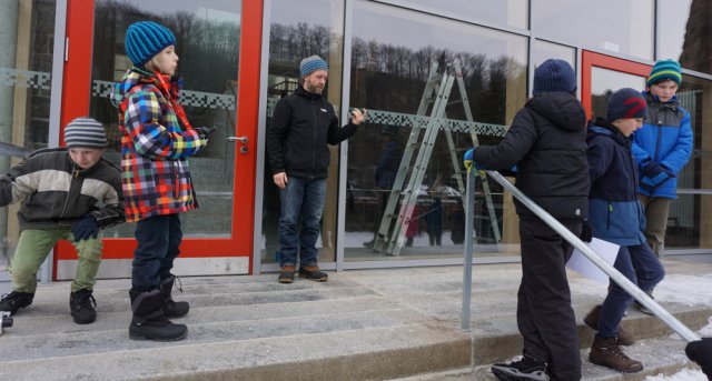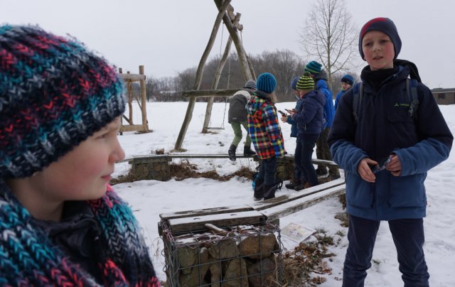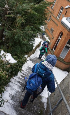 Ab 9:55 Uhr durften wir als Reporter die Gruppe bei ihrem dritten Projekttag begleiten. Treffpunkt war wieder Zimmer 101 (momentan Klassenzimmer der 5a), dort gab es schnell wieder eine kleine Einweisung und dann ging es ab auf den Hof, hierbei war jeweils eine Hälfte der Gruppe mit Frau Geißler auf dem vorderen Teil des Hofes und die andere Hälfte mit Herrn Kahl auf dem hinteren Teil zu Gange. Als die Übungen dort erfolgreich abgeschlossen waren, gab es für alle erst einmal eine ausgiebige Mittagspause. Im Anschluss an die Mittagspause sind wir dann mithilfe von Koordinaten und Karten auf die Johanneshöhe gelaufen. Eigentlich wollten wir dann noch den Sonnentempel aufsuchen, aber leider war der Weg zu vereist und wir konnten ihn aufgrund von zu hoher Verletzungsgefahr nicht benutzen.