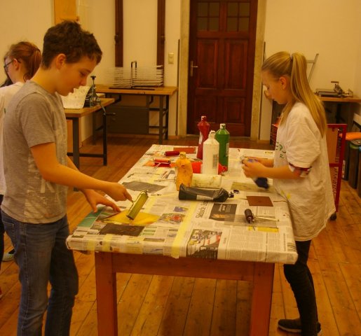 Nach dem Schneiden werden die Linoleumplatten mit Farbe eingestrichen, sodass am Ende beim Drucken nur die hochgestellten Druckstellen auf dem Papier zu sehen sind. Heute wurden vor allem Linoleumschnitte erstellt, damit sie morgen gedruckt werden können. Ein Teil der Schüler hat aber auch heute schon gedruckt.