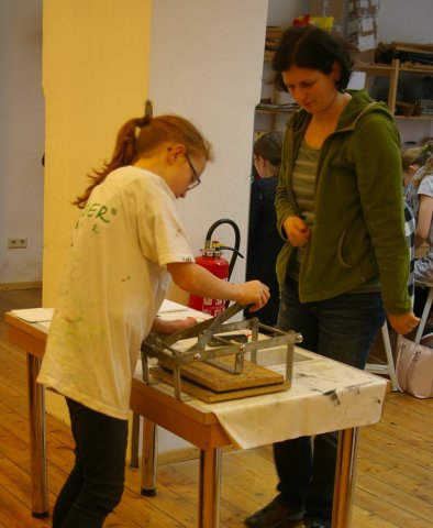 Schüler schneiden in Linoleumplatten ihre Muster, die sie vorher ausgesucht haben. Diese können, wie eben gesagt, vorgegebene Muster sein, die Projektteilnehmer können sich aber auch eigene Muster ausdenken.