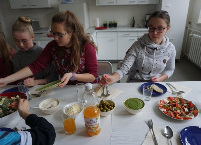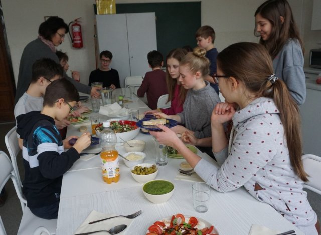 Glücklicherweise stand der zweite Tag des Italienisch-Projektes unter einem besseren Stern als der erste: Wie geplant, konnte heute unter Leitung von Frau Wenzel (und mit Unterstützung von Herrn Krahmer) italienisch gekocht werden. Am Anfang wurden alle Schüler in unterschiedliche Gruppen eingeteilt, die eines der vier Gerichte zubereiten würden. Diese unterscheiden sich in zwei Vorspeisen (Tomate-Mozzarella, Brotsalat), eine Haubtspeise (Spaghetti Bolognese/Pesto) und eine Nachspeise (Tiramisu). Nach langer Zusammenarbeit und Kochen haben wir alles gemeinsam gegessen.