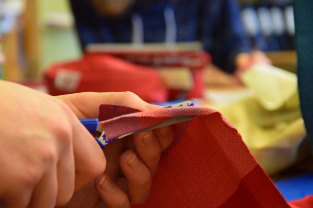 Das Patchwork-Projekt geht heute in die 2. Runde, aber leider nur mit sieben Schülern. Diesmal sind wieder zwei Jungs dabei, die auch eifrig am Nähen sind. Geleitet wird das Projekt dieses Mal von Frau Woldrich.