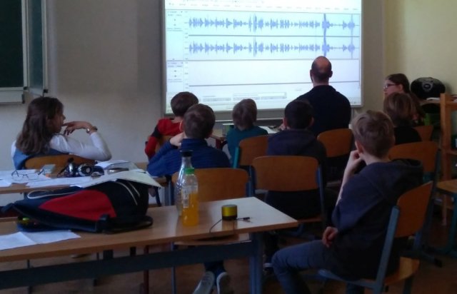 Da nun alle Teile aufgenommen wurden sind, lernen die Schüler, wie man eine Tonreihe bearbeitet, indem sie es auf dem Whiteboard gezeigt bekommen.