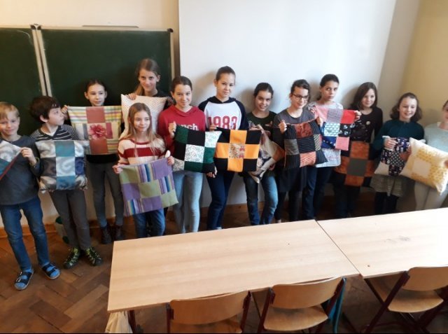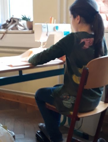 Anfangs nähten alle die Rückseite ihres Kissens fertig, was man Hotelöffnung nennt. Sie nähten heute sehr selbstständig und brauchten nicht mehr so viel Hilfe von den Lehrern und Eltern, weil sie nun genug Erfahrung haben.