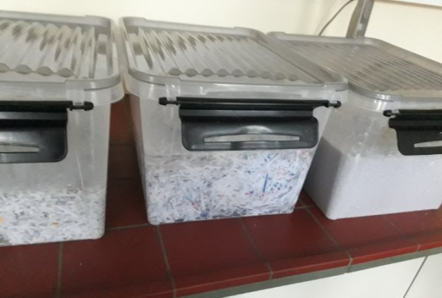 Als sie vom Papierholen zurück waren, schrederten sie es bzw. rissen sie es auseinander. Nun verarbeiten sie es in einem großen Eimer mit Wasser zu neuem sauberem Papier. Doch wie geht das?