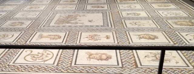 Das Mosaik, das der Halle ihren Namen gab, war 5,60 m lang und 5,48 m breit und ist ein modern überarbeitetes Mosaik aus der römischen Kaiserzeit. Es zeigt Gesichter und Masken. Jedoch bestehen Zweifel an der Echtheit des Mosaiks, vor allem wegen der unbeholfen wirkenden, eckigen Darstellung der Münder und dem wiederkehrenden, an Oktopusarme erinnernden Abschluss der Masken.