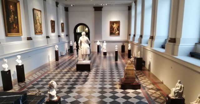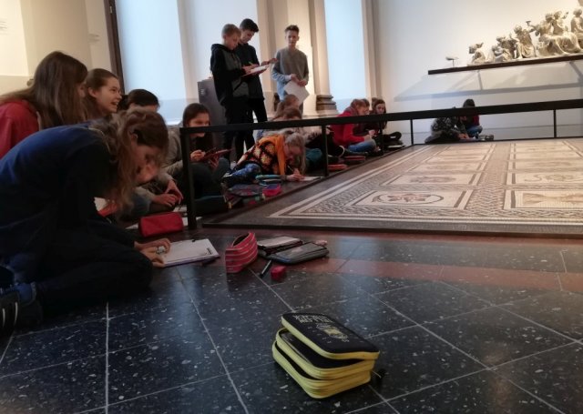 Im Albertinum schauten sie sich zuerst die eindrucksvolle Mosaikhalle an, wo die Schüler vorgegebene Aufgaben erledigten. In der Halle gibt es viele Skulpturen aus Gips und Marmor, außerdem hängen an den Wänden Ölgemälde. In der Mitte der Halle steht eine Statue von Gotthold Ephraim Lessing.