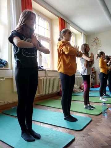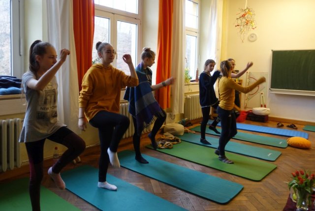 Stille erfüllt den Raum, ab und zu unterbrochen durch das Ticken der Uhr und das Kratzen unserer Stifte. Auf dem Boden liegen Matten und runde Kissen. Wir befinden uns im Zimmer E01, in welchem sich diese Woche rund 20 Schüler mithilfe von Yogaübungen entspannen. Angeleitet wird dieser Schlüssel zur inneren Ruhe und Entspannung von Frau Hausold, die schon 13 Jahre Erfahrung mit Yoga hat.