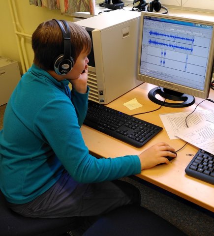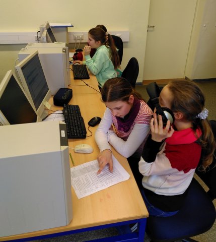 Nach dem Video wurden alle Kinder mit Kopfhörern und Headsets ausgestattet und es ging es in den PC-Raum. Dort haben die Kinder dann gleich damit begonnen, das Programm Audacity zu öffnen und ihre am Vortag aufgenommenen Tonspuren zu bearbeiten. Zwischendurch haben die Fünft- und Sechstklässler natürlich noch etwas herumexperimentiert, bis sie am Ende des Tages ihre Werke gemeinsam anhören konnten.