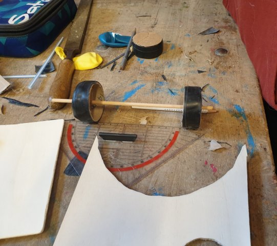 Es gibt im E-Auto-Projekt verschiedene Gruppen, die aus Holz etwas sägen und basteln. Die einen basteln eine Rakete, die anderen basteln ein Auto.
