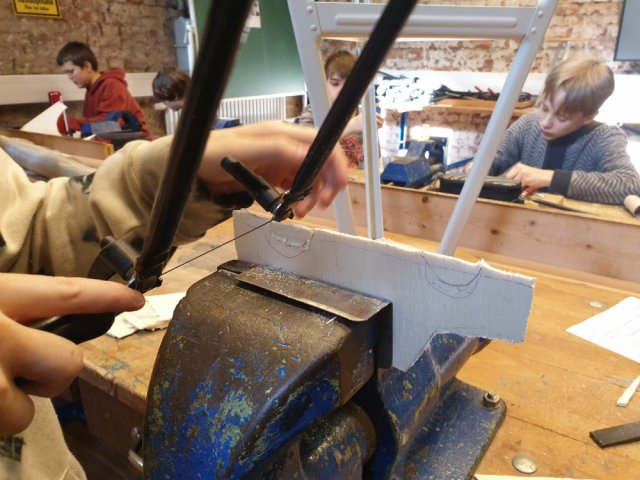 9:35 Uhr machen die Teilnehmer Frühstückspause und alle dürfen erst einmal etwas trinken und essen. 9:55 Uhr treffen sie sich wieder und arbeiten fleißig weiter. Ab und zu kommt es dazu, dass sie ein Loch bohren müssen oder dass die Sehne der Laubsäge kaputt ist. Dann muss der Gruppenleiter eingreifen. Aber auch wenn einer/eine eine Frage stellt, muss er die Frage(n) beantworten.