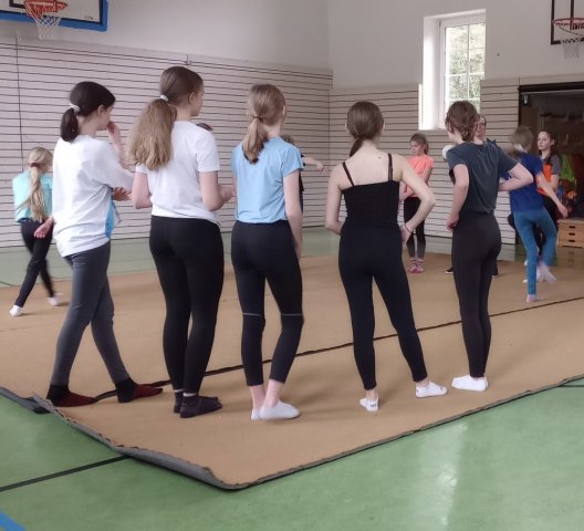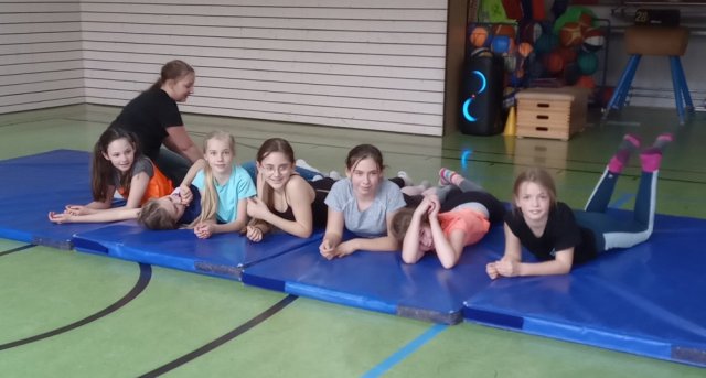 Nachdem wir einen "Schwimmwettbewerb" gemacht hatten, übernahm Frau Magister, die uns für den Rest des Tages betreute. Zuerst spielten wir ein lustiges Spiel, dann machten wir Körperspannungs- und Vertrauensübungen. Gegen 11.00 Uhr spielten wir "Baumstämme" (wir rollten nacheinander über alle drüber). Außerdem machten wir Rollen und Räder.