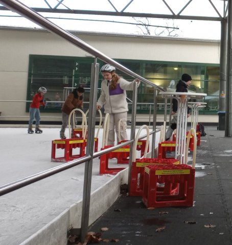 Nach einer kleinen Frühstückspause liefen wir zurück ins Freizeitzentrum „Hains“. Dort durften wir ein paar Runden auf dem Eis drehen. Zusammen mit der Eis & Schnee-Gruppe zeigte uns Frau Stag einige Übungen zum besseren Fahren