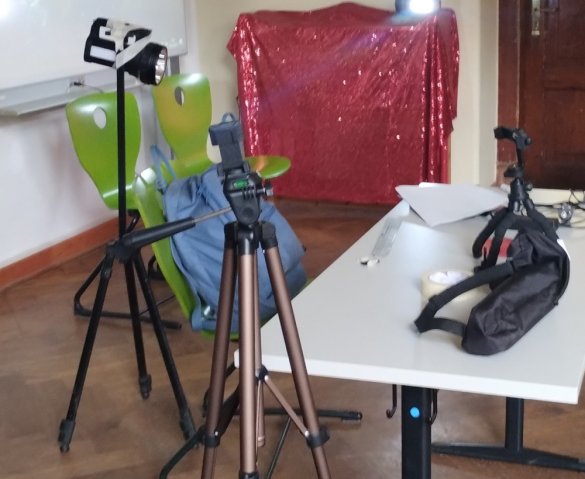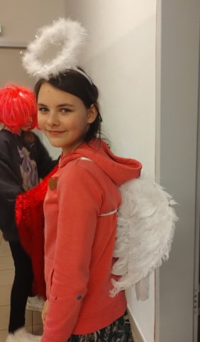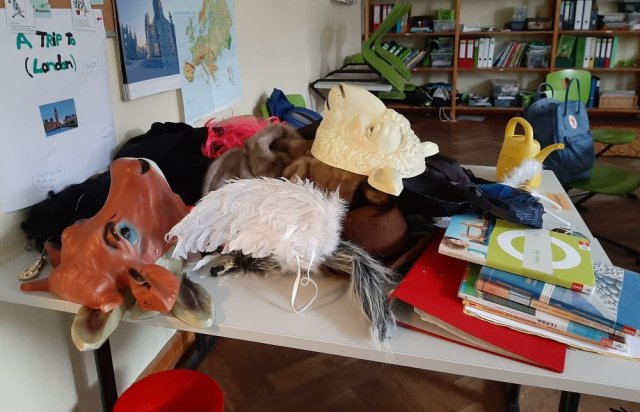 Da wir in den nächsten Tagen auch zufällige Personen aus dem Schulgebäude interviewen wollen, wurde auch schon eine Fotoecke mit Beleuchtung, Kameras etc. aufgebaut, um die Antworten fotografisch festzuhalten. Die nötigen Requisiten waren auch schnell gefunden. Mit ihnen gab es dann noch lustiges Verkleiden und eine Runde durchs Schulhaus, wobei sehr viel Gekicher und interessante Kommentare im Spiel waren.