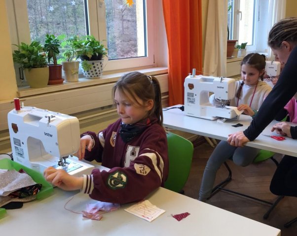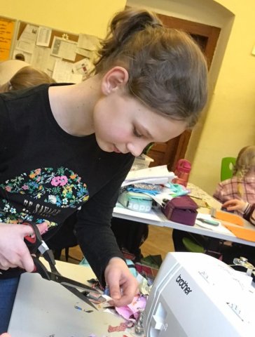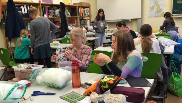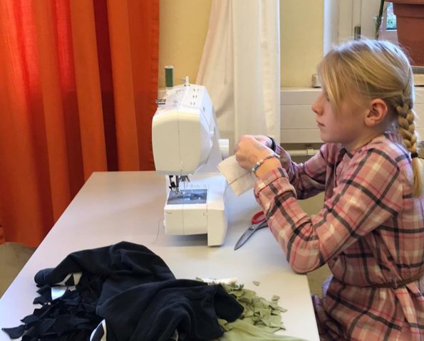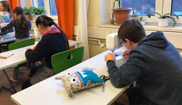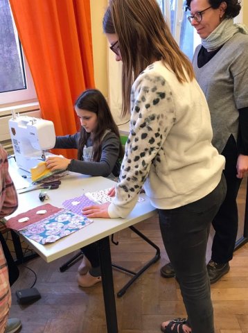 Nach der Vorarbeit haben Schülerinnen angefangen nähen zu üben. Viele konnten schon gut mit Nähmaschine umgehen. Deshalb konnten sie auch bald anfangen, die Stoffteile ihres Sorgenfressers zusammenzunähen. Und das war's jetzt erst mal für heute. Morgen geht es weiter.