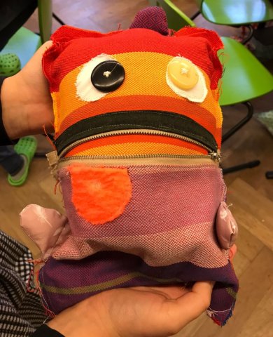 Auch heute haben die Teilnehmer wieder am Sorgenfresser genäht und ihn anschließend mit den zerschnittenen Kleidungsresten, die sie an den Tagen davor vorbereitet hatten, ausgestopft. Es dauerte nicht lange und viele waren mit ihren Sorgenfressern fertig. Danach konnte man entweder ein Lavendelkissen oder eine Reißverschlusstasche nähen.
