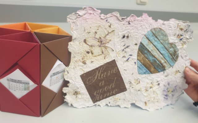 Das Projekt Upcycling hat heute gelernt, wie man aus Altpapier neues Papier selber herstellt. Außerdem auch, wie man aus alten Kalendern coole Stifteboxen oder Organizer selbst bastelt.