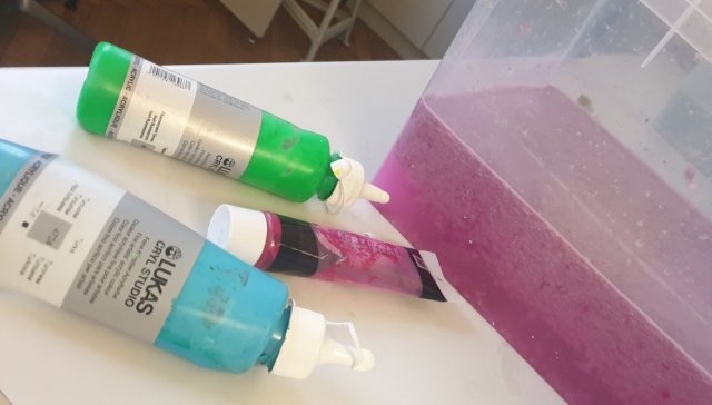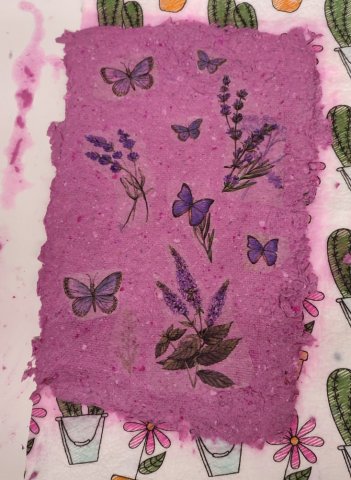 Die Teilnehmer des Projekts Upcycling haben heute das Papier fertig gemacht, indem sie es nun geschöpft und dann mit Farbe eingefärbt haben.