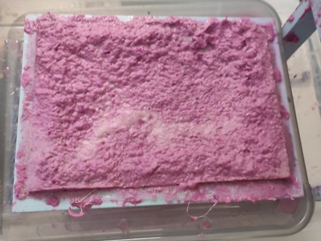 Anschließend haben sie das zerkleinerte Papier in Wasser gegeben damit es aufgeweicht, und sie die Masse dann in eine rechteckige Form geben können.