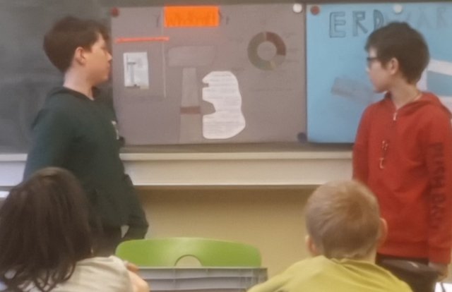 Dann erklärte Thomas der Sonnenenergie-Gruppe, wie eine Solarzelle aufgebaut ist. Danach haben die Gruppen ihre Plakate vorgestellt. Die Erdenergie-Gruppe war nicht so gut vorbereitet, während die Gruppen Wind- und Wasserenergie super vortrugen.