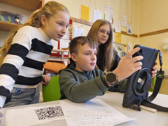 Ich fühle mich noch müde, da es früh am Tag ist, aber es herrscht eine heitere Stimmung, die ebenfalls vorhanden ist, als Herr Stankewitz die QR-Codes zur Verfügung stellt und alle Leute sie mit Eifer im Schulgebäude verteilen. Kurz vor der Frühstückspause meint sogar ein Schüler, dass er am liebsten die Pause durchmachen würde, da es ihm so viel Spaß macht.
