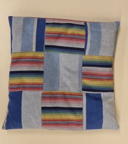 Bald darauf wurden zwei Hinterteile angenäht, eins war länger und das andere kürzer, sodass ein Hotelbezug(-Schlitz) zum Befüllen eines Kissens entsteht. Der Bezug konnte dann Zuhause mit einem Kissen befüllt werden.
