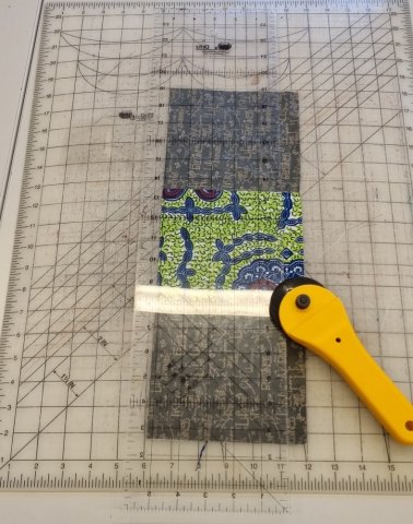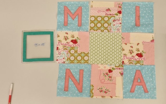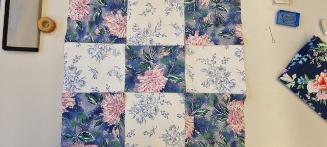 Um das Niner-Patch zu nähen, musste man 9 Stoffquadrate, jedes 15 cm mal 15 cm, zuschneiden. Bevor sie sie zuschnitten, mussten sie sie aber noch bügeln.