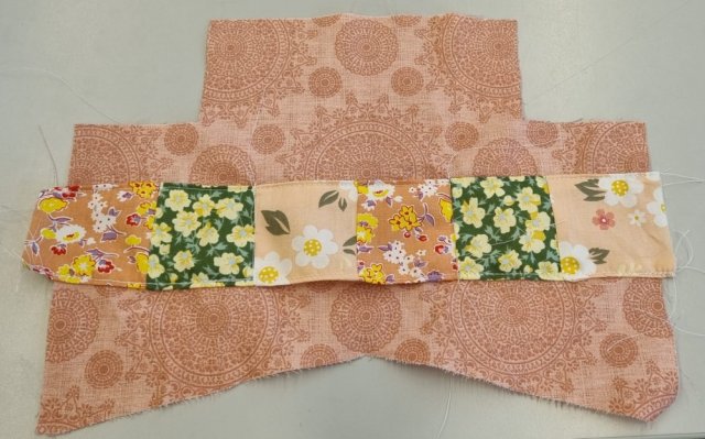 Der Innen- und der Außenstoff wurden gebügelt, nach Schablonen geschnitten und noch einmal gebügelt. Der Innenstoff sollte stabil sein, damit das Körbchen steht und die zwölf Rechtecke sollten mindestens aus zwei verschiedenen Stoffen bestehen. Die beiden Stoffe wurden dann zusammengenäht und beendet (Ziel). Die 12 Stoffe wurden dann gebügelt und daran angenäht.