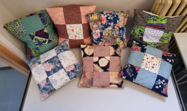 Man konnte aber auch etwas anderes machen, wie z. B. ein zweites Niner-Patch. Wer schnell war, konnte auch Kissenbezüge mit Lavendel oder Zirbenholz gefüllte Kissen machen.