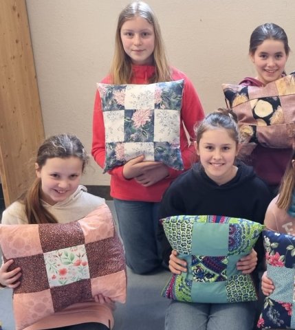 Die Schülerinnen und Schüler sollten bei beiden Kissen die Ecken innen abschneiden und dann umkrempeln. Bei dem Zirbenholzkissen wurde der zugeschnittene Stoff für das Innenkissen gebügelt, zusammengenäht (außer ein kleines Loch), die Ecken gekürzt, alles gleichmäßig geschnitten, durch das Loch umgekrempelt, Zirbenholz hineingefüllt und die Öffnung mit dem Matratzenstich zu genäht.